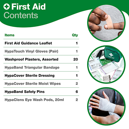 • Essential First Aid Supplies – Contains essential supplies for providing first aid in an emergency.